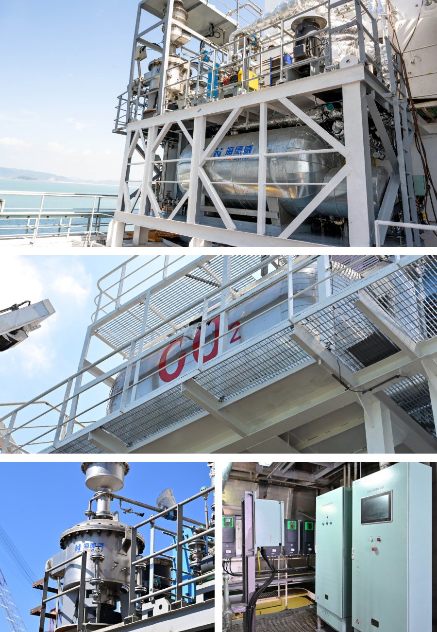 海洋衛(wèi)士?船載碳捕集系統(tǒng)依托海德威自主設(shè)計(jì)的高速離心脫碳技術(shù)和國能新能源院高性能GNX-3吸收劑,以高速旋轉(zhuǎn)形成的離心力場替代傳統(tǒng)重力場,顯著提升了氣液兩相傳質(zhì)效率,系統(tǒng)脫碳效率超過90%,二氧化碳捕集純度可達(dá)99.6%以上,具有脫碳效率高、體積小、能耗低、安裝及儲(chǔ)運(yùn)便捷等優(yōu)勢(shì)。
